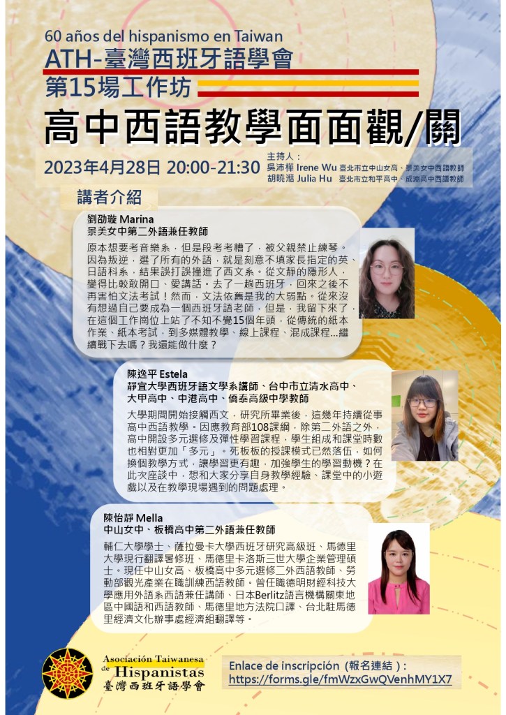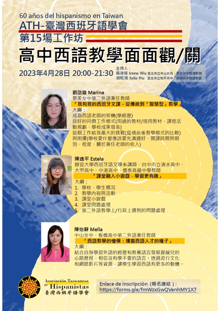 未分類 臺灣西班牙語學會第15場工作坊 高中西語教學面面觀/關 分類: athtaiwan 於 16 三月 20236 十月 2023 工作坊報導報導下載 分享此文: 分享到 X(在新視窗中開啟) X 分享到 Facebook(在新視窗中開啟) Facebook 喜歡 正在載入... 相關